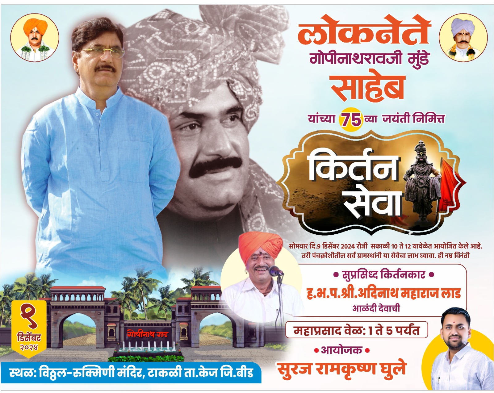 लोकनेते स्व.गोपीनाथराव मुंडे यांची ७५ वी जयंती समाजप्रबोधनपर कार्यक्रम घेऊन साजरी करण्याचा निर्णय युवानेते सुरज रामकृष्ण घुले यांनी घेऊन टाकळी येथील विठ्ठल – रुक्मिणी मंदिरात सोमवारी सकाळी ११ वाजता आळंदी (देवाची) येथील ह.भ.प. आदिनाथ महाराज लाड यांचे कीर्तन आयोजित केले आहे.कीर्तनानंतर भाविकांसाठी महाप्रसाद वाटप करण्यात येणार आहे.या कार्यक्रमास पंचक्रोशीतील भाविकांनी उपस्थित राहून लाभ घ्यावा.असे आवाहन युवानेते सुरज रामकृष्ण घुले यांनी केले आहे.
