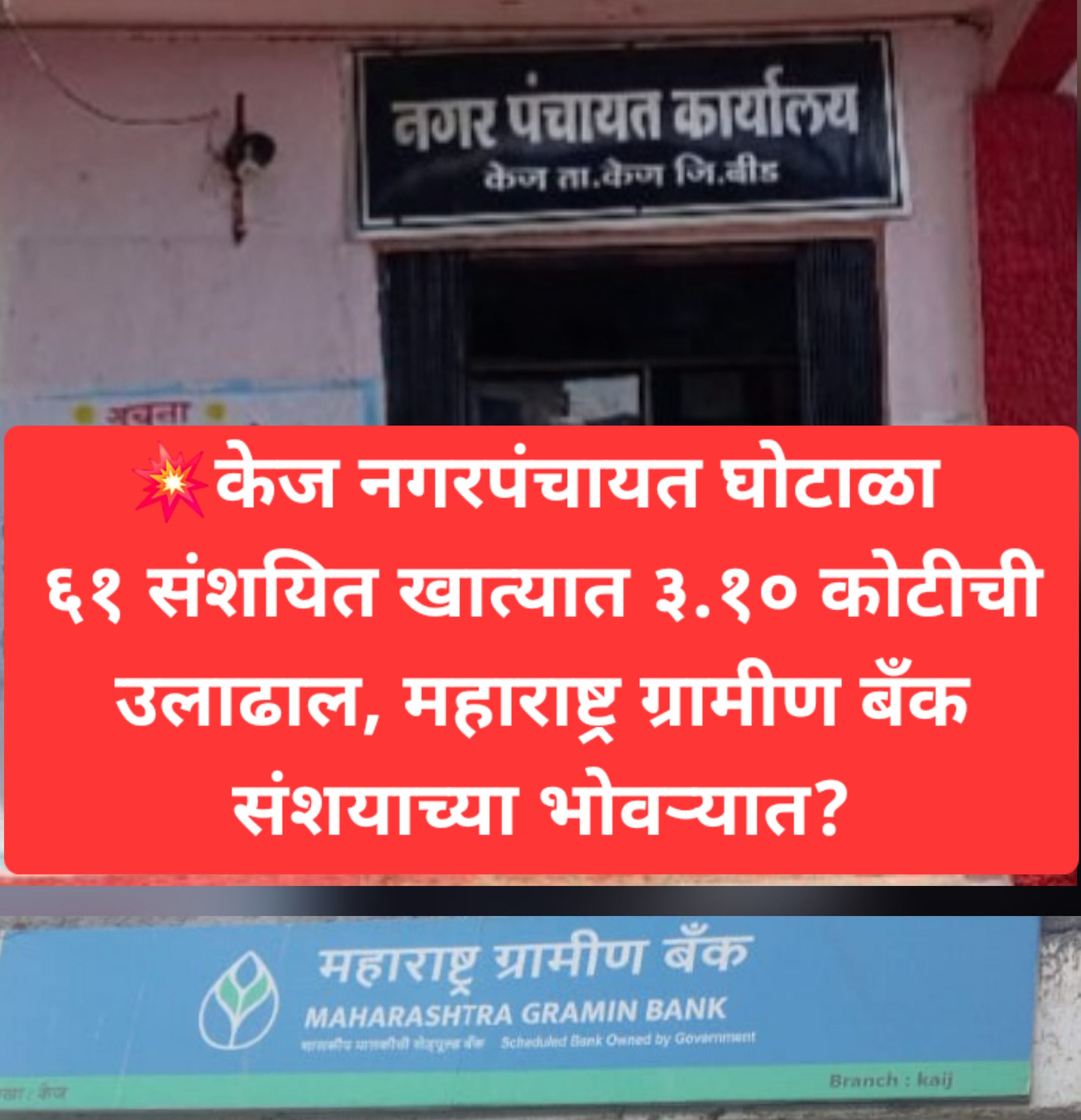 рд╕рд╡рд┐рд╕реНрддрд░ рдмрд╛рддрдореА рдХреЗрдЬ рдирдЧрд░рдкрдВрдЪрд╛рдпрддрдордзреАрд▓ рей рдХреЛрдЯреА ремреи рд▓рд╛рдЦрд╛рдВрдЪреНрдпрд╛ рдШрд░рдХреБрд▓ рдШреЛрдЯрд╛рд│реНрдпрд╛рдЪреНрдпрд╛ рдЪреМрдХрд╢реАрдд рдЖрддрд╛ рдЕрддреНрдпрдВрдд рдзрдХреНрдХрд╛рджрд╛рдпрдХ рдмрд╛рдм рд╕рдореЛрд░ рдЖрд▓реА рдЖрд╣реЗ. рдЪреМрдХрд╢реА рд╕рдорд┐рддреАрдиреЗ рдкреНрд░рдзрд╛рдирдордВрддреНрд░реА рдЖрд╡рд╛рд╕ рдпреЛрдЬрдирд╛ рдЕрдВрддрд░реНрдЧрдд рдЕрд╕рд▓реЗрд▓реНрдпрд╛ рдЦрд╛рддреЗ рдХреНрд░рдорд╛рдВрдХ реорежрежрежрелрейрежреорелрелрекрез (рдорд╣рд╛рд░рд╛рд╖реНрдЯреНрд░ рдЧреНрд░рд╛рдореАрдг рдмрдБрдХ, рд╢рд╛рдЦрд╛ рдХреЗрдЬ) рдпрд╛рдЪреЗ рдмрдБрдХ рд╕реНрдЯреЗрдЯрдореЗрдВрдЯ рдорд╛рдЧрд╡рд┐рд▓реНрдпрд╛рдирдВрддрд░ рдЕрдиреЗрдХ рдЧрдВрднреАрд░ рдкреНрд░рд╢реНрди рдирд┐рд░реНрдорд╛рдг рдЭрд╛рд▓реЗ рдЖрд╣реЗрдд.